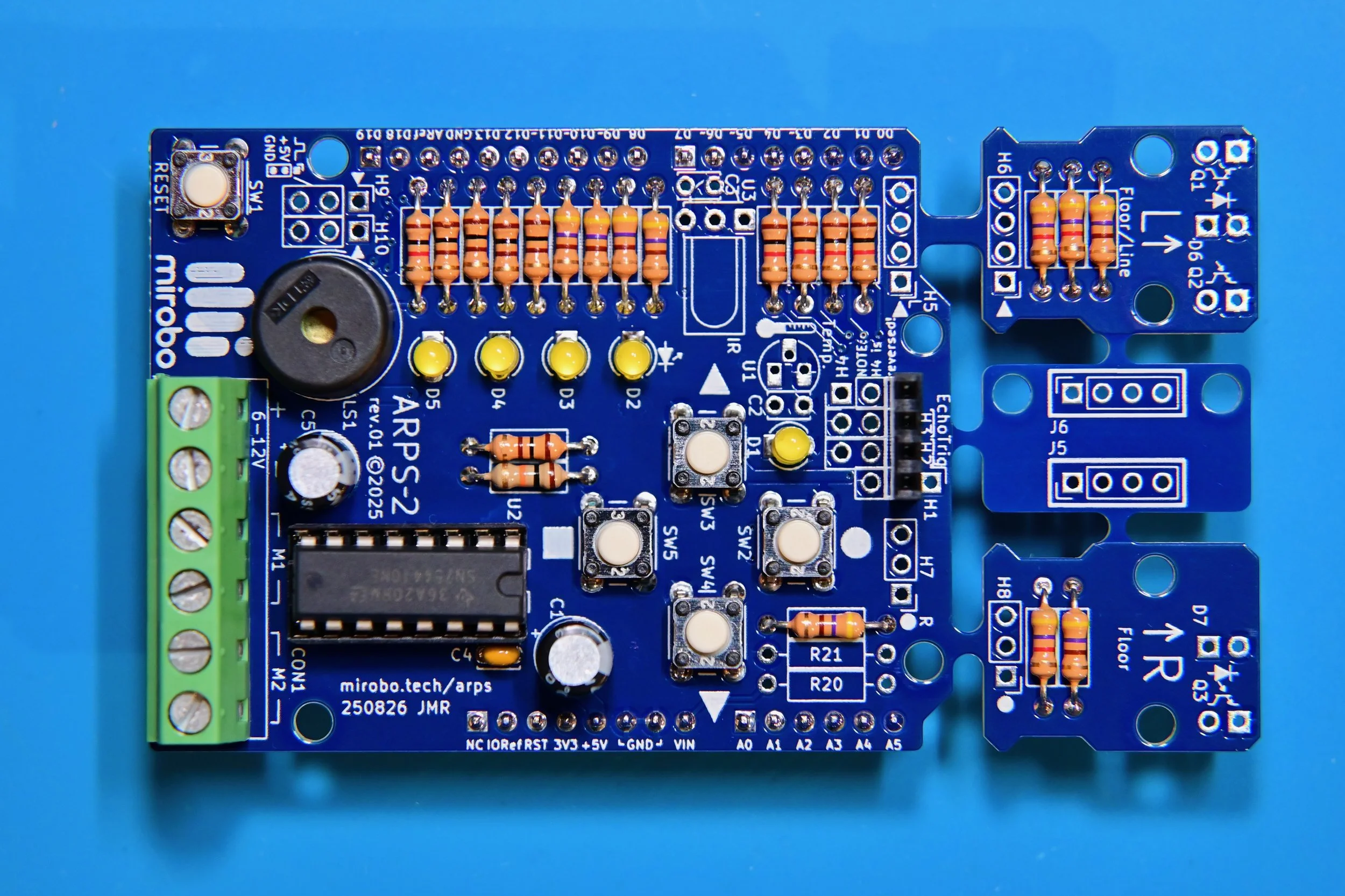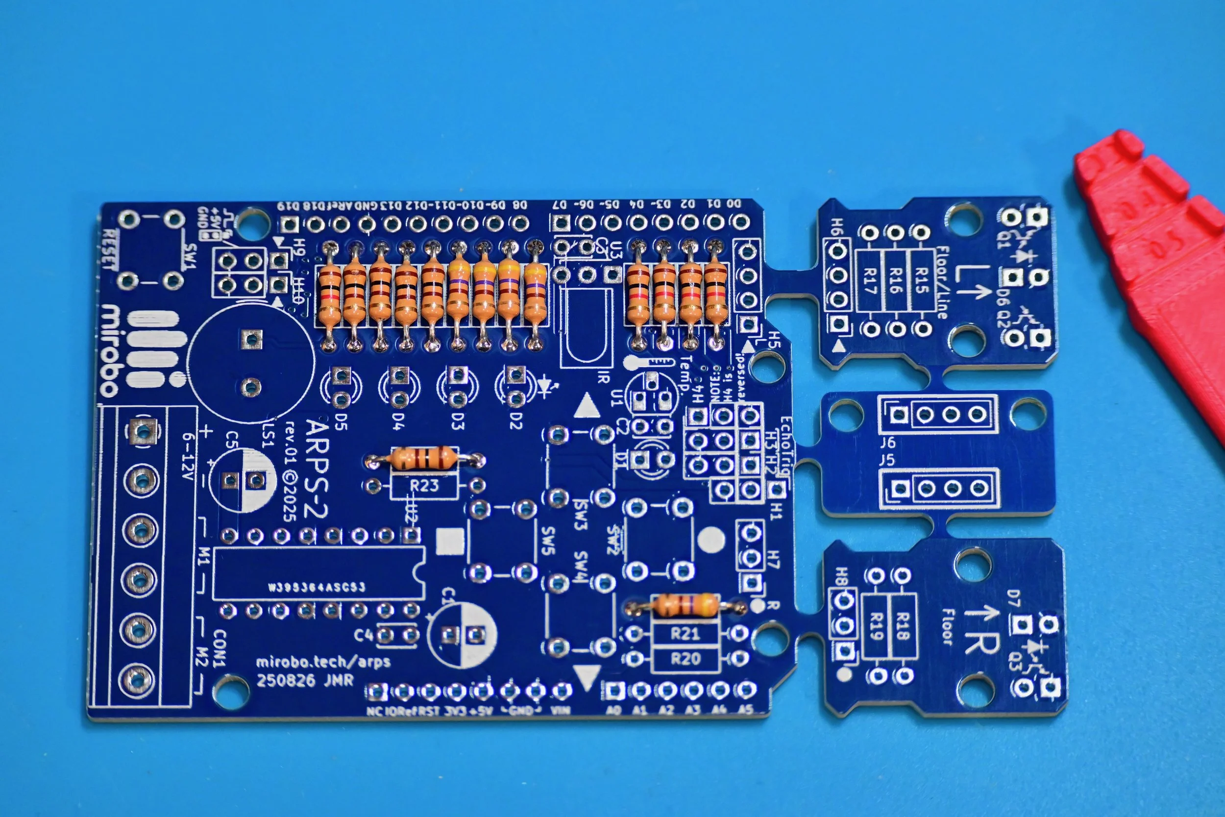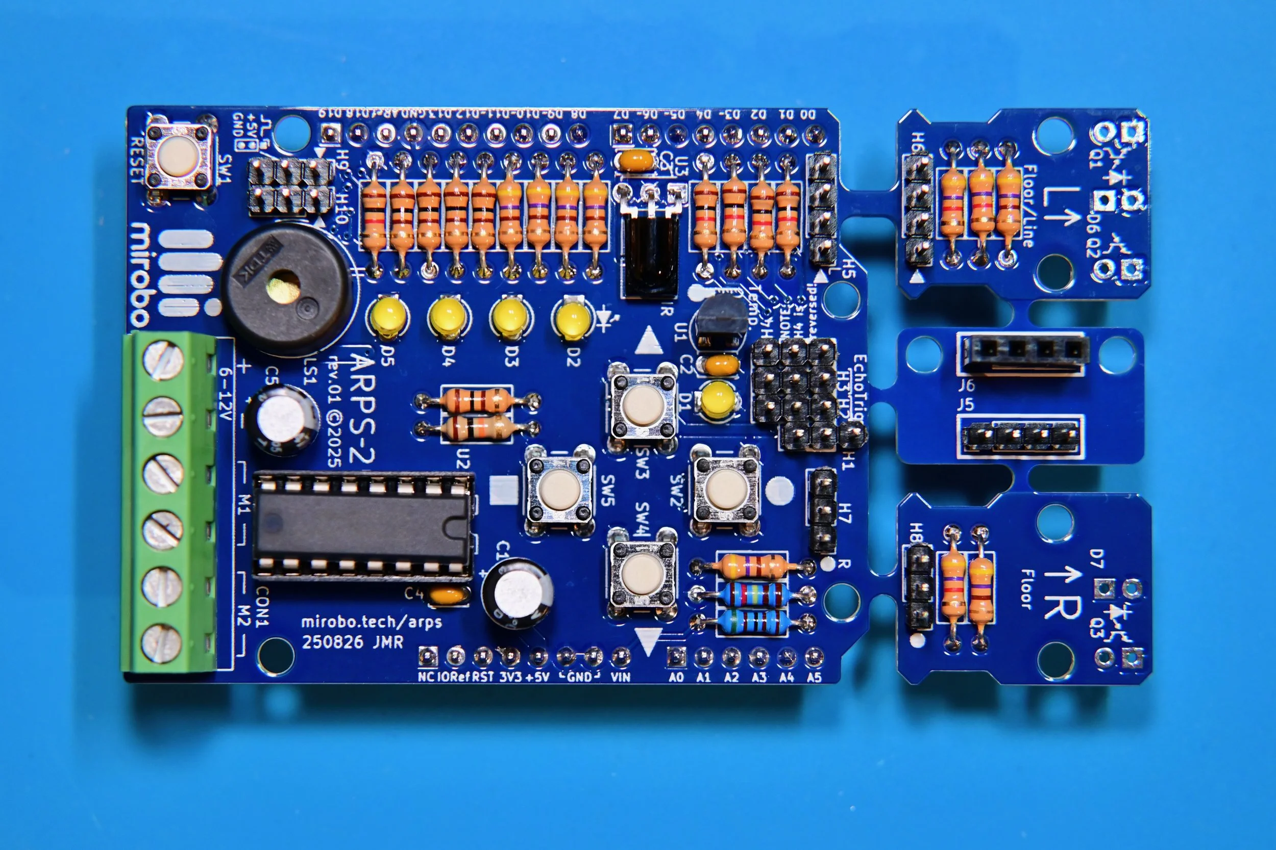 ARPS-2 features break-away left and right (labelled L and R) optical sensor modules making it easy to create robot floor, wall, or line sensors. Each optical sensor module can remain attached to the main ARPS-2 PCB, or they can be broken away and re-attached using extension cables connected between headers H5 and H6, and H7 and H8.
