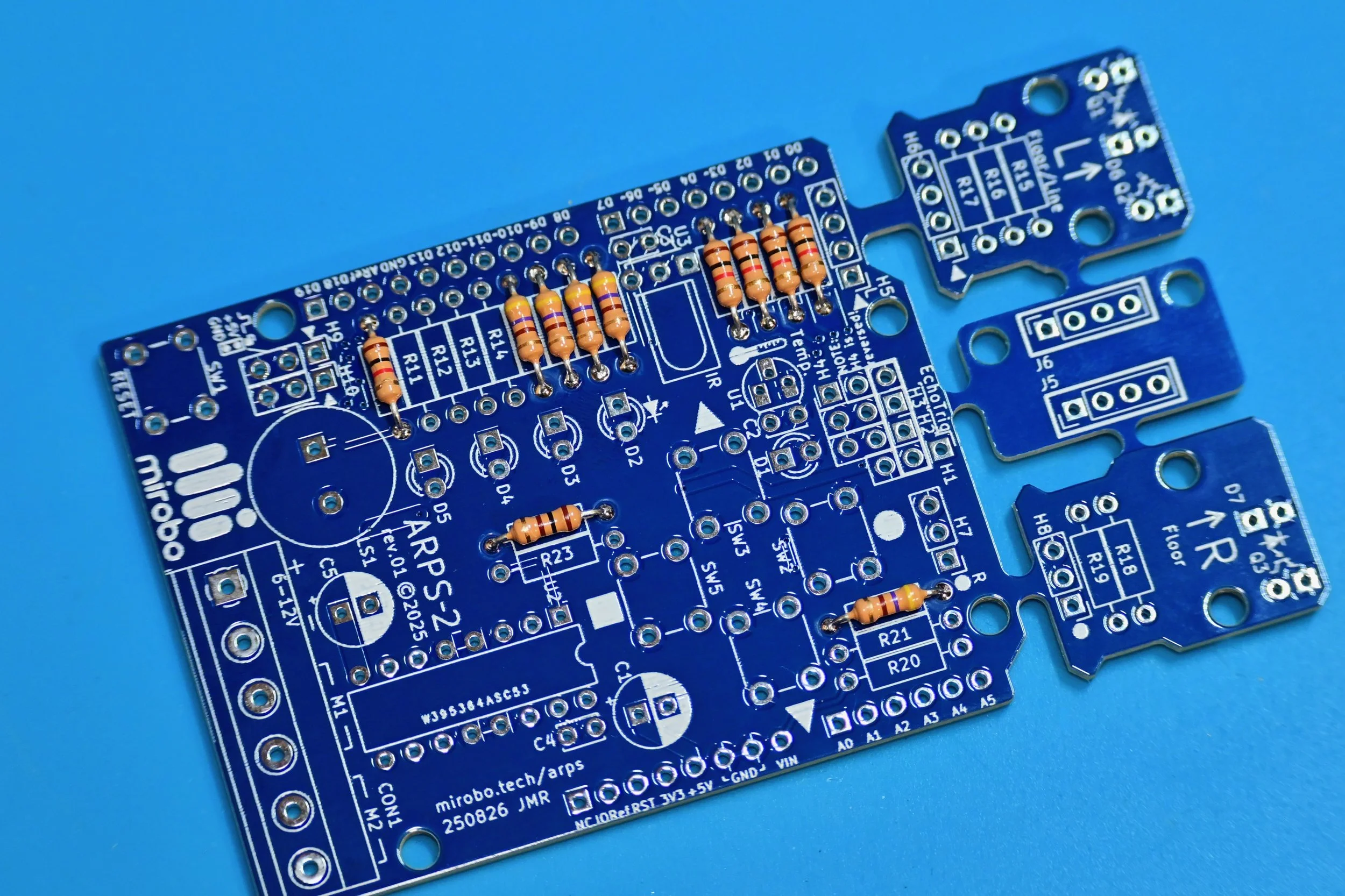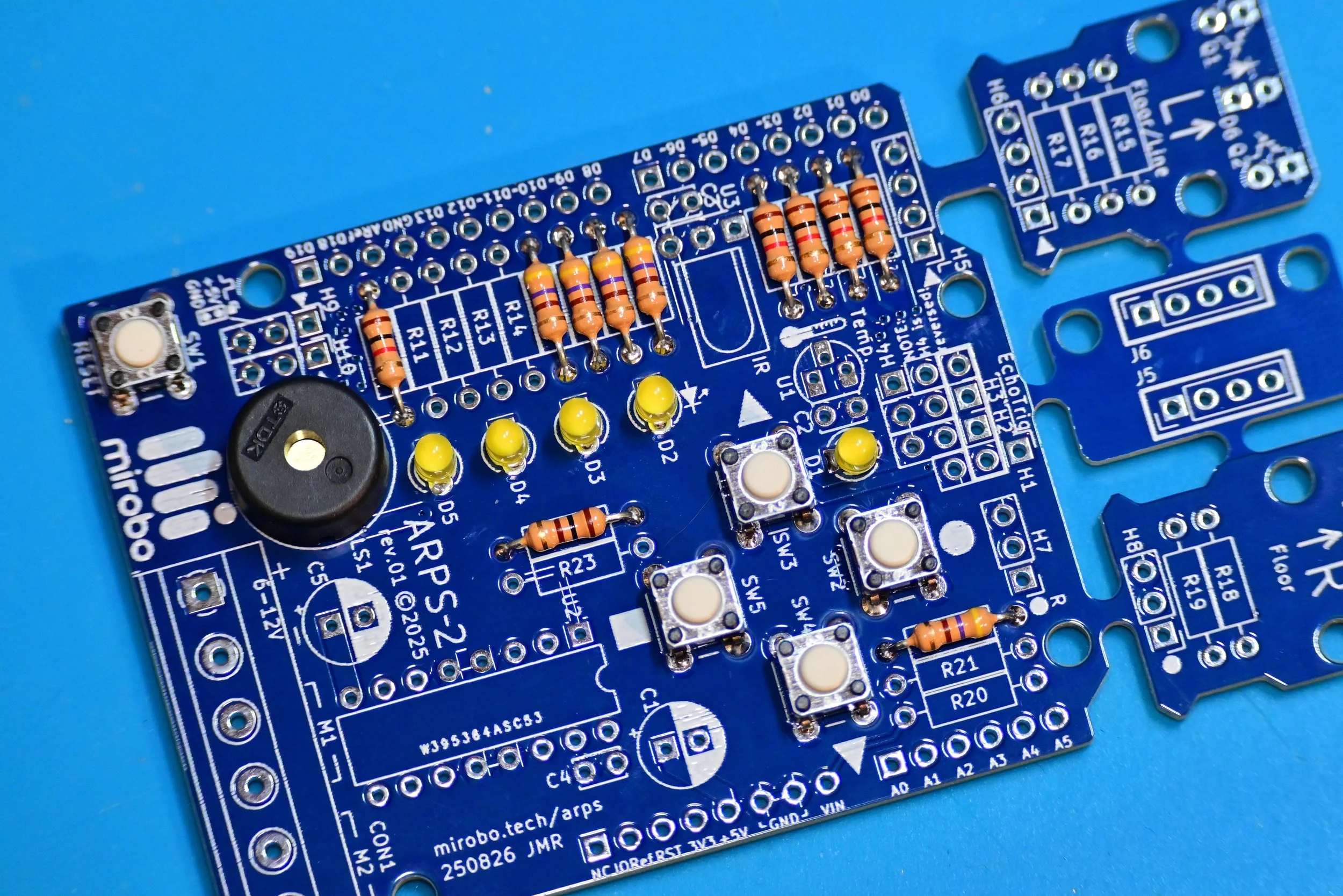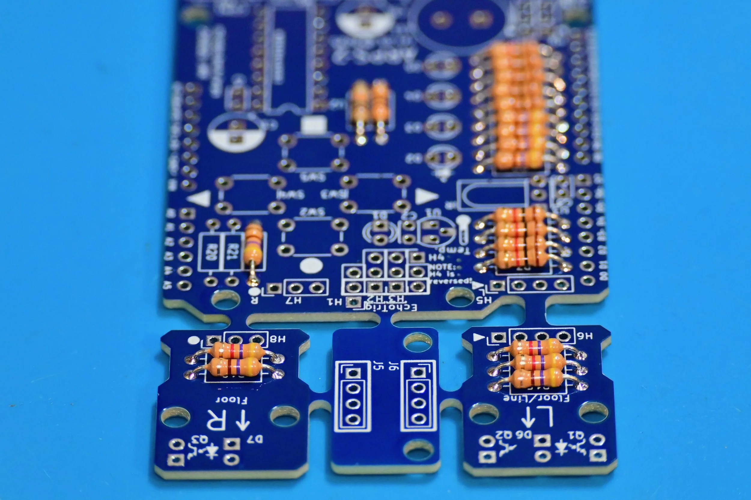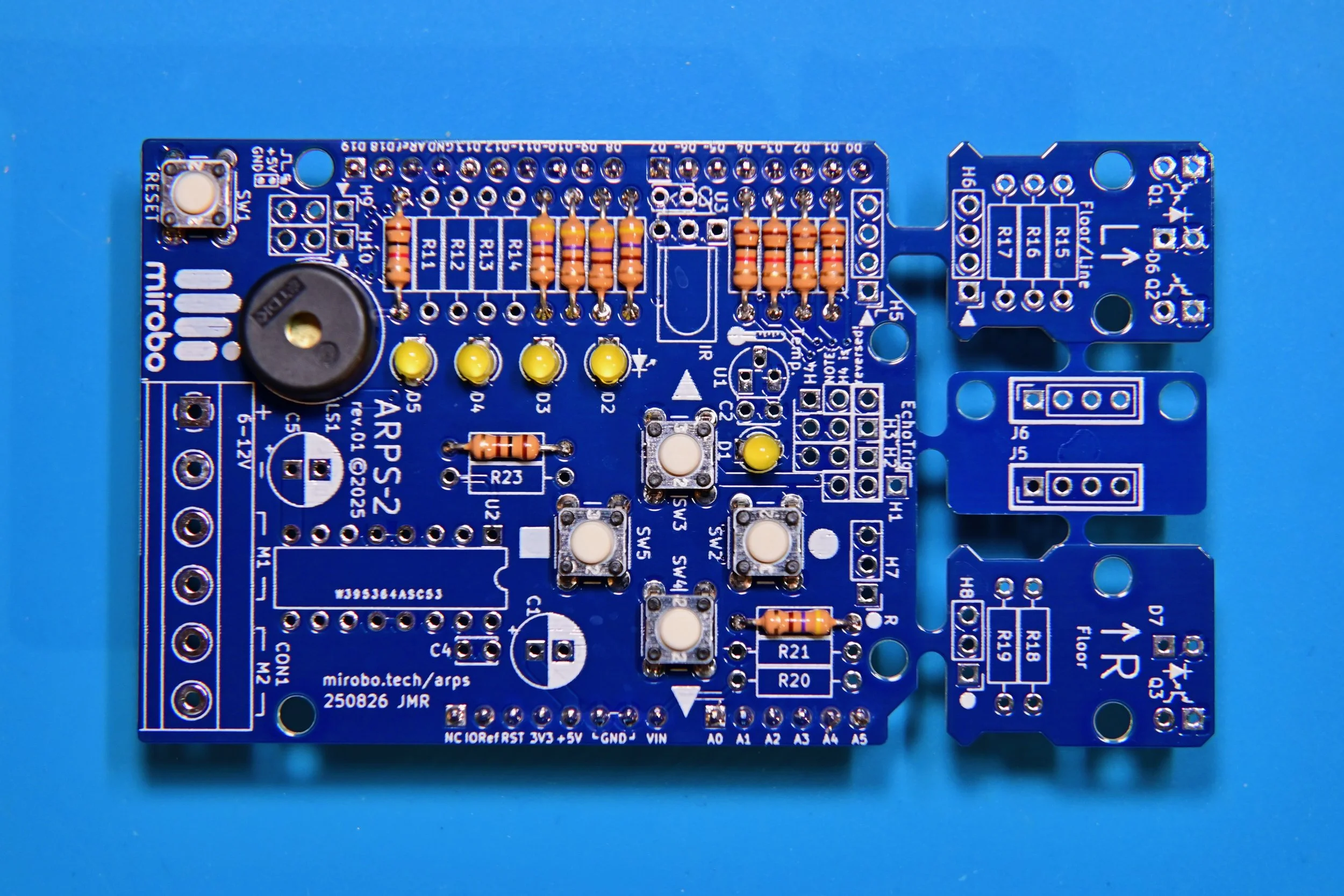ARPS-2 features break-away left and right (labelled L and R) optical sensor modules making it easy to create robot floor, wall, or line sensors. Each optical sensor module can remain attached to the main ARPS-2 PCB, or they can be broken away and re-attached using extension cables connected between headers H5 and H6, and H7 and H8.