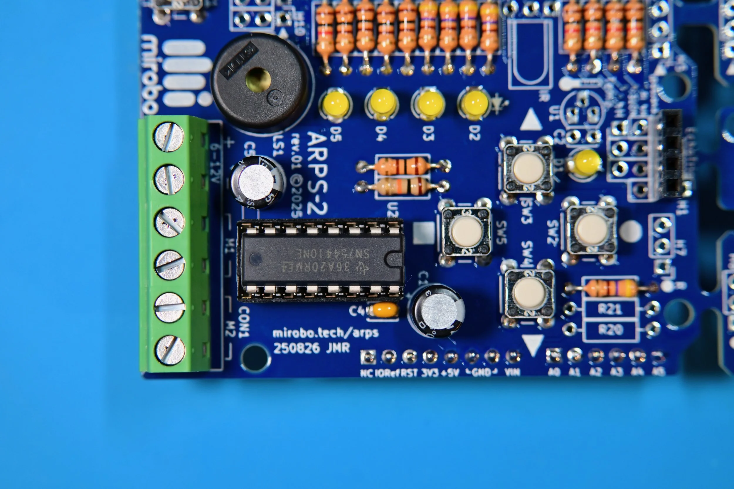 Install a 16-pin DIP IC socket for motor driver IC U2 when ARPS-2 is used in educational settings, or when using low current DC motors. (Since the PCB ground plane acts as a heat sink, it is better to solder the motor driver IC directly into the PCB when using high current motors – although this makes replacement in the event of a motor driver IC failure much more difficult).