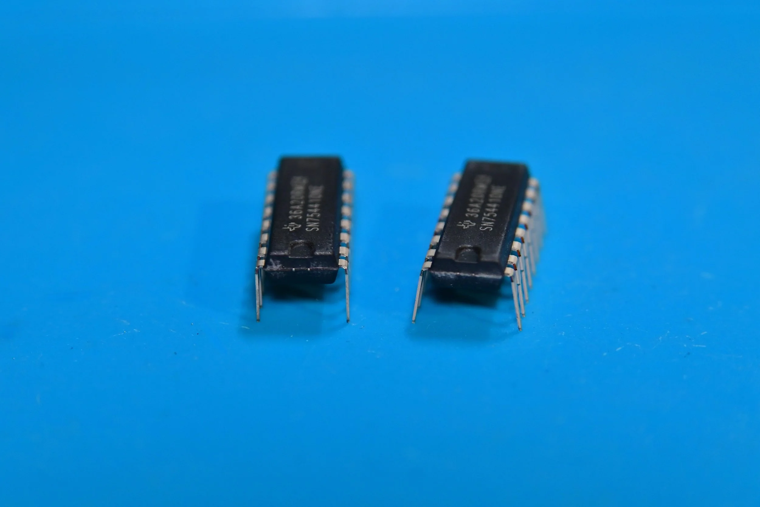 Prepare the motor driver IC (Integrated Circuit) for installation into its socket by straightening its pins so that they face directly downwards, at a 90° angle perpendicular to the IC body as shown by the motor driver IC on the left.